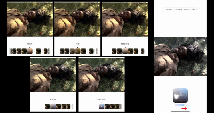 Your undertone options are Amber, Gold, Rose Gold, Neutral, and Cool Rose. Obviously you can alter tone and color for each. You can also use the slider under the grid to change the intensity of your palette. Slide it all the way down and you’re back to the original image. Slide it up and you get a full undertone look.
