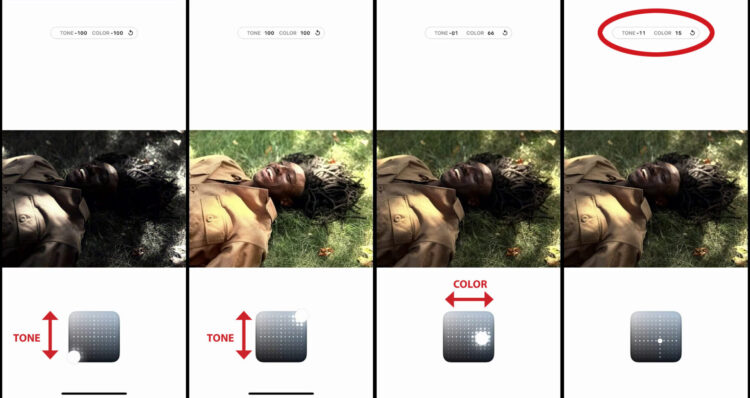 I actually really like this edit system Apple created because it’s intuitive. As we move around, you’ll see numbers changing at the top. That means after you’ve made edits—or if your subject asks, “What photographic style do you like on yourself?”—they can literally tell you, “Hey, I like Standard, minus 11 tone, plus 15 color.”