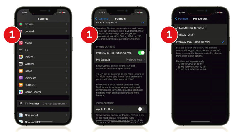 The default is ProRAW Max. Make sure ProRAW is turned on. This is where you decide—do you really need 48 megapixels, or can you get away with ProRAW 12 megapixel?